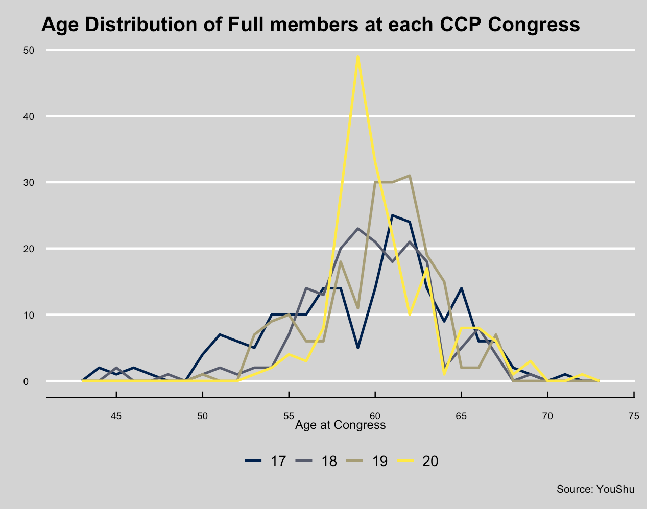 [3] A note on method. I’ve sourced dates of birth from online biographies. When a day/month was unavailable I’ve assumed the first day of the month/January. In a very small number of cases (notably with PLA members) I’ve been unable to find a date of birth, so I have omitted these delegates from the dataset. A handful of alternates get promoted to full Central Committee status during the five-year term, but I’ve just focused on their age at the Congress.