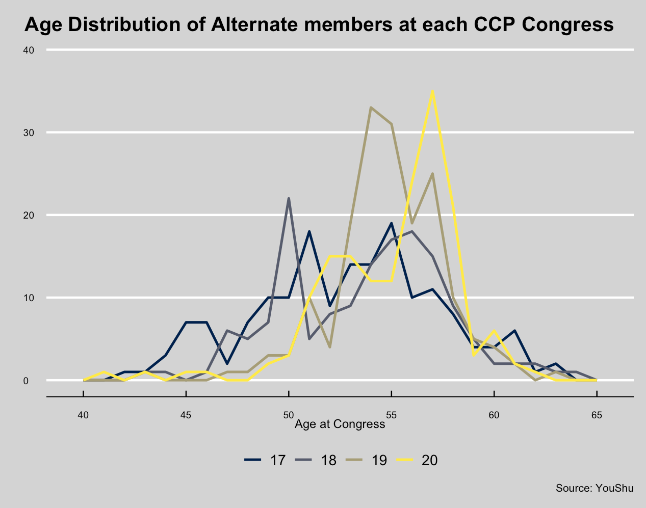 But wait, you might shout – what about the alternate members? Each Congress elects some 170 alternates, those who (supposedly) wait in the wings to take up leadership positions in the future.[5] Surely the 20th Congress’ batch of them are more youthful, right?